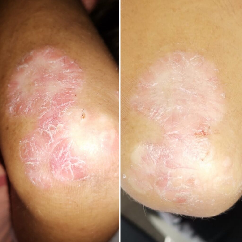 desquamazione ridotta, attenuazione del rossore, pelle più idratata e compatta, regressione dell’infiammazione con tessuto più uniforme.