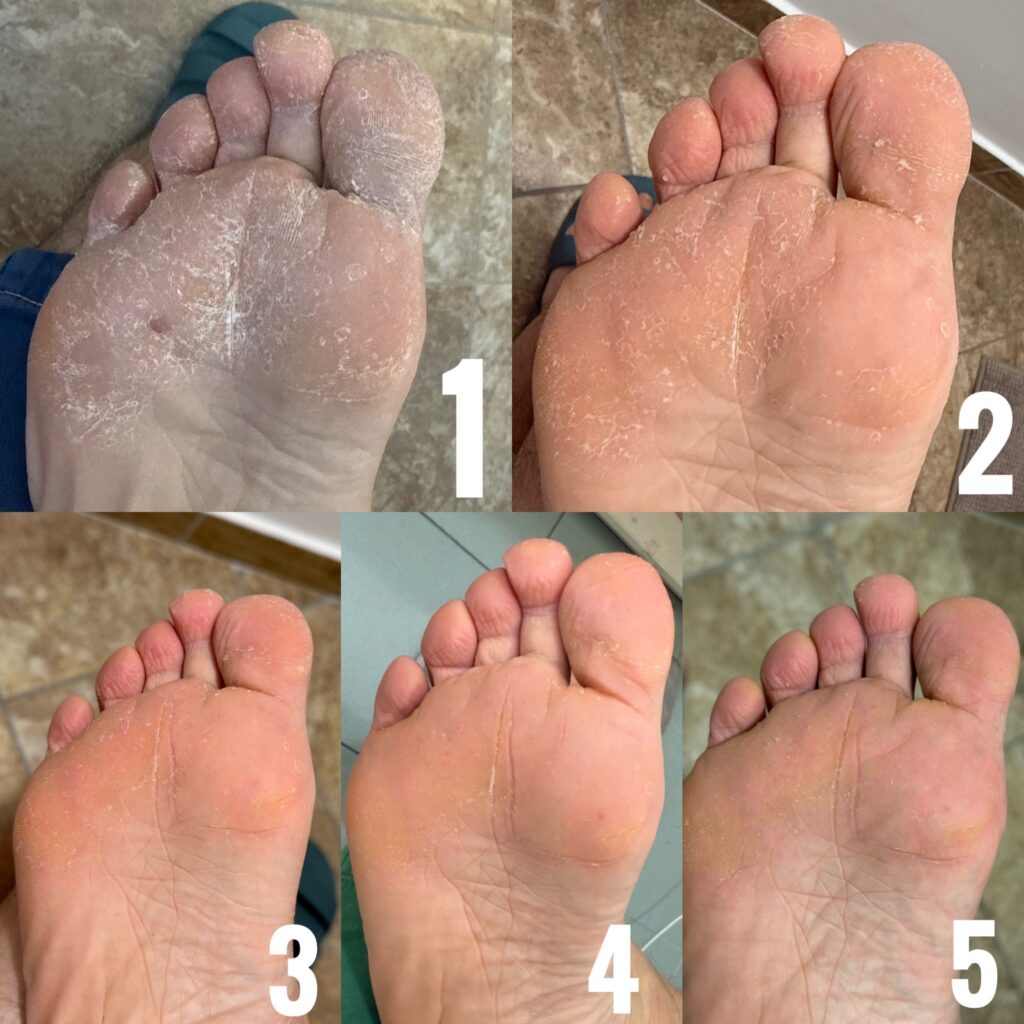 remissione quasi totale dei sintomi, rigenerazione cutanea evidente, chiusura delle fissurazioni e miglioramento stimato al 90%.